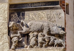 Helaas staat in Luthers kerk van Wittenberg (de Stadtkirche) nog altijd het beeldhouwwerk de ‘Judensau’. Het werd daar geplaatst in 1305. Dergelijke sculpturen en houtsnijwerken werden in de Middeleeuwen in veel kerken bevestigd en bleven eeuwenlang populair. Afgebeeld is een rabbi die een – voor Joden onrein – varken vastgrijpt, haar achterwerk optilt om het van onderen te bestuderen. Andere Joden drinken samen met biggen uit de tepels van de zeug. Erboven staat de inscriptie: ‘Rabini Shem Hamphoras’, een zinspeling op ‘Shem ha me phorasch’ wat betekent: ‘de volledig uitgesproken naam van God’ (de naam die voor orthodoxe Joden heilig is).